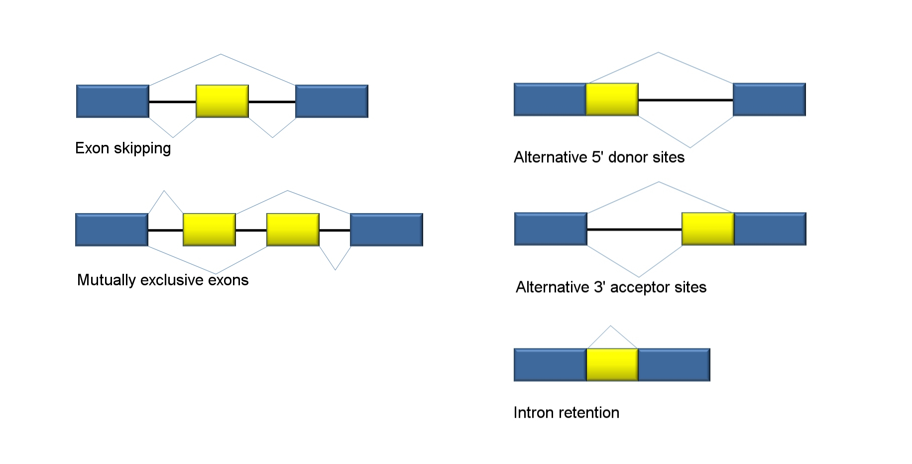 Bio-Express RNA-seq Alternative-splicing Pipeline (이하 AS)은 유전자 발현의 전사체 수준에서 크게 5가지 type의 splicing 양상을 확인할 수 있다.Alternative splicing은 하나의 유전자를 구성하는 복수의 exon (coding region)간의 조합에 따라 여러 transcripts (isoforms)가 생성되며, 이에 따라 하나의 유전자라도 서로 다른 구조를 갖는 단백질이 만들어짐에 따라 기능이 다른 유전자로써 역할을 하게된다. 이러한 메커니즘을 통해 단백질의 폭넓은 capacity 를 확보할 수 있으며, 다양한 분자적 역할이 가능하다.